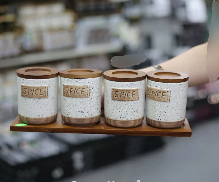 طقم بهارات بورسلان - طقم بهارات بورسلان واغطية خشب بامبو - ايدين جلد سحب - داير جلد مطاط سحب مانع لتسرب الهواء - ستاند خشب - اربع قطع |