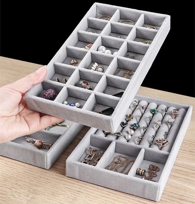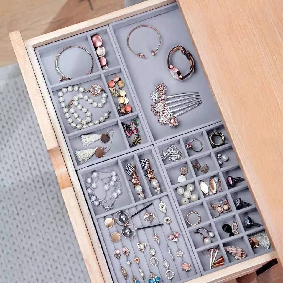 منظم درج قطيفه 4*1 حاجه كده فوق الخيال منظم كده تقدري تجمعي فيه كل حاجه مكون من 4 قطع بتقسيمات مختلفه منظم رباعي لتنظيم المجوهرات والاكسسوارات وترتيبها والحفاظ عليها من الضياع أو التلف لا يشغل مساحه في الدرج ممكن رصهم في الدولاب فوق بعض مش جنب بعض منتج مستورد عالي الجوده |