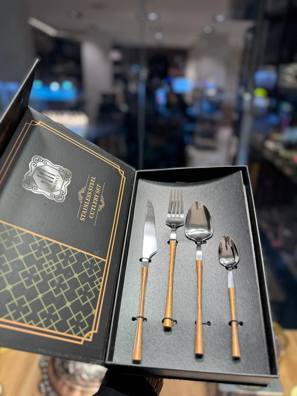 طقم معالق استاليس 24قطعه بالعلبه شيك جداااا ع سفرتك متاح منه السيلفر والجولد 18/8 استاليس مكونه من 6معلقه كبيره 6معلقه صغيره 6شوكه 6سكينه |