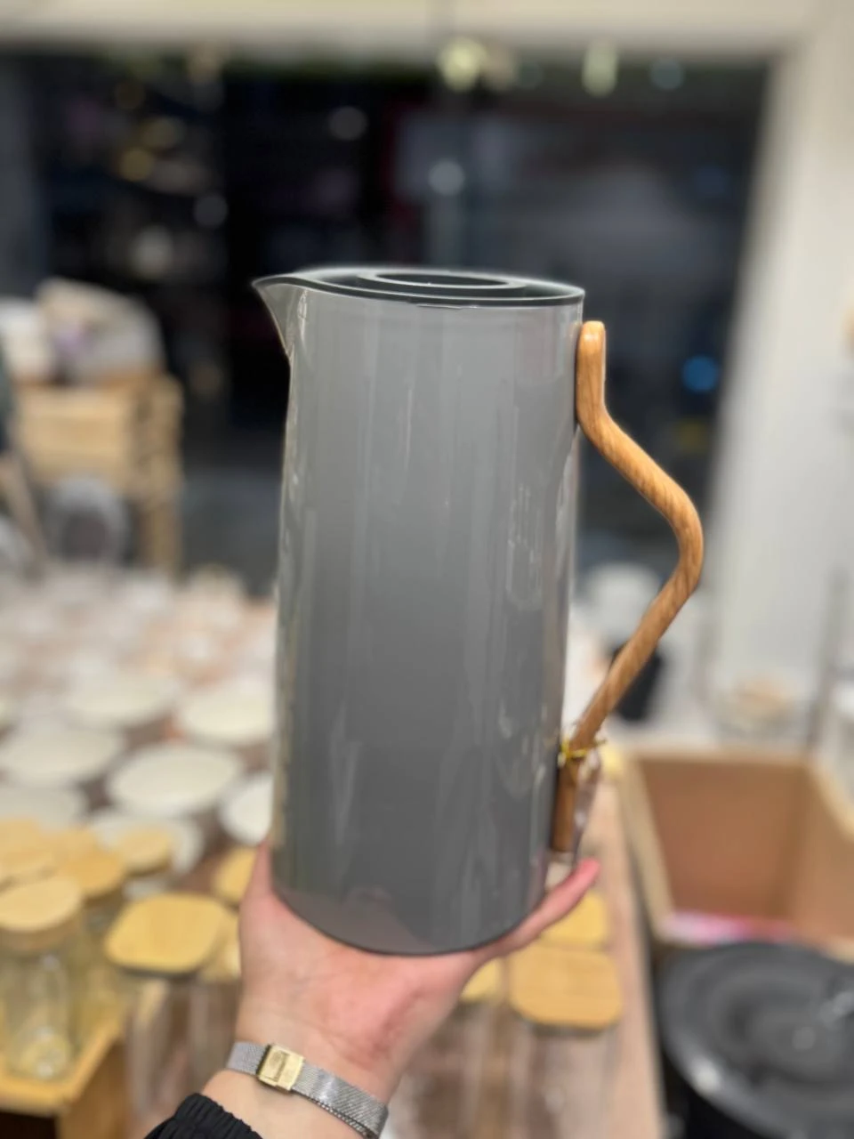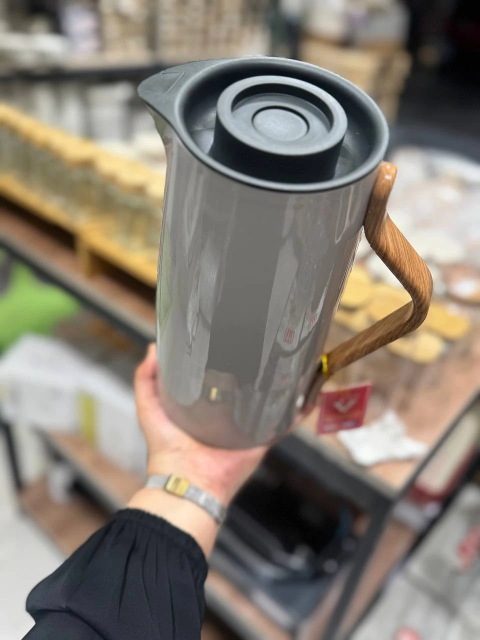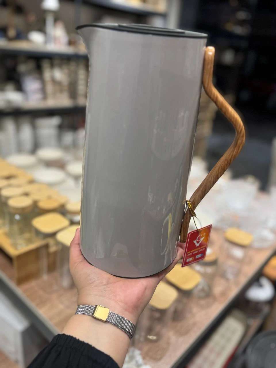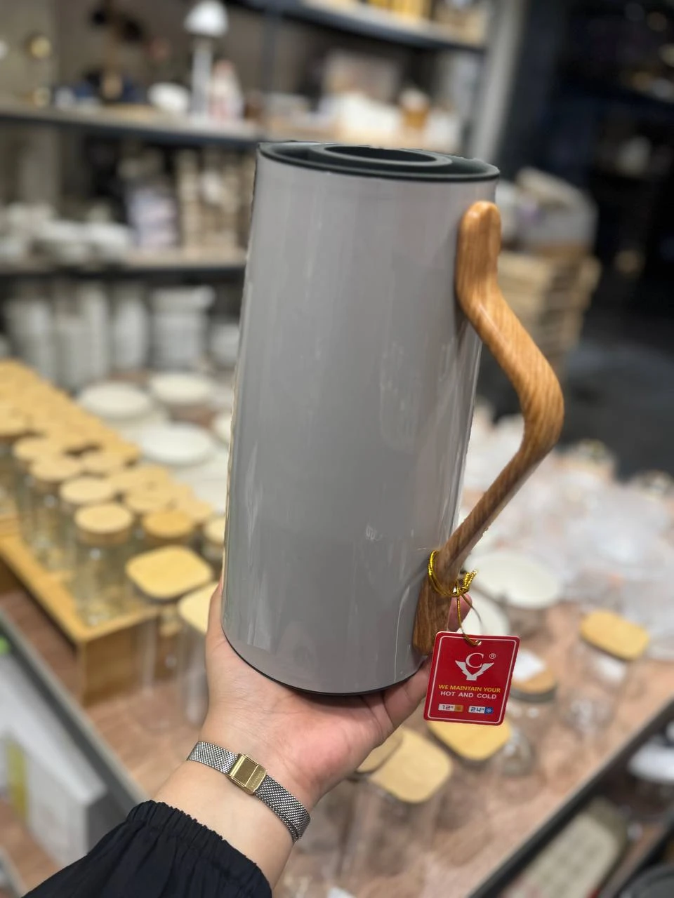 ترمس عربي يد وغطاء خشبى ترمس شيك جدا ومناسب ف العزومات سعة 1 لتر حافظ للحراره و البروده زجاج من الداخل و يد خشب |