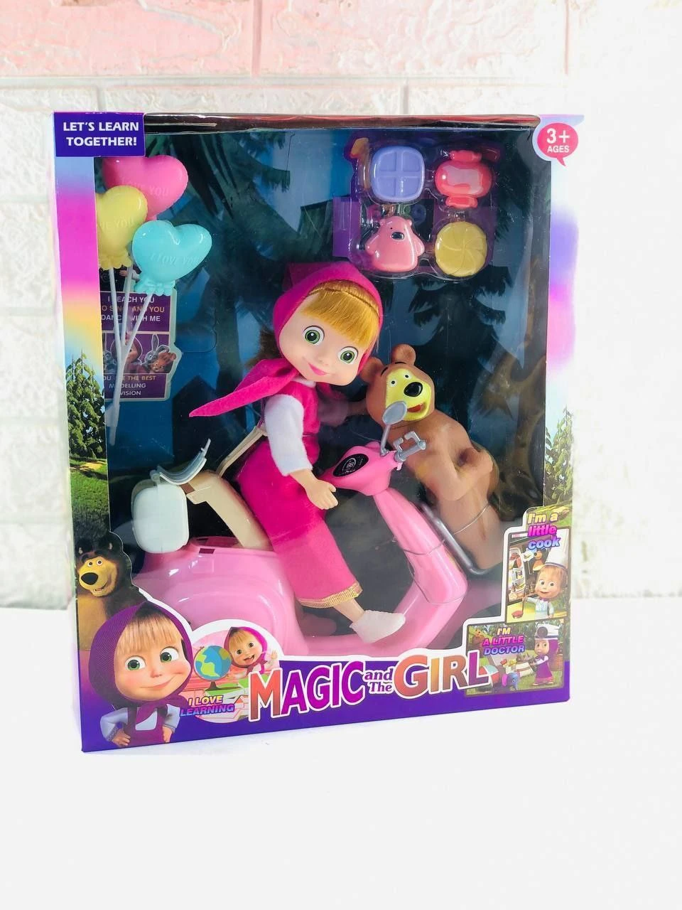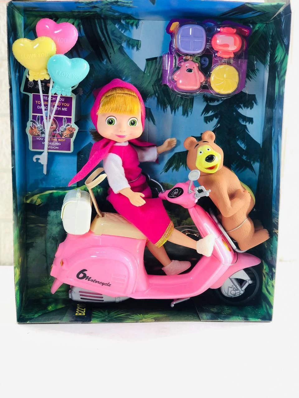 العروسة ماشة المعروفة الماشة اللي الاطفال بيحبها ومعها الدب اللي في الكرتون وفيسبا وقلوب المقاس : ٢٤ سم مكونة من ١١ قطعه |